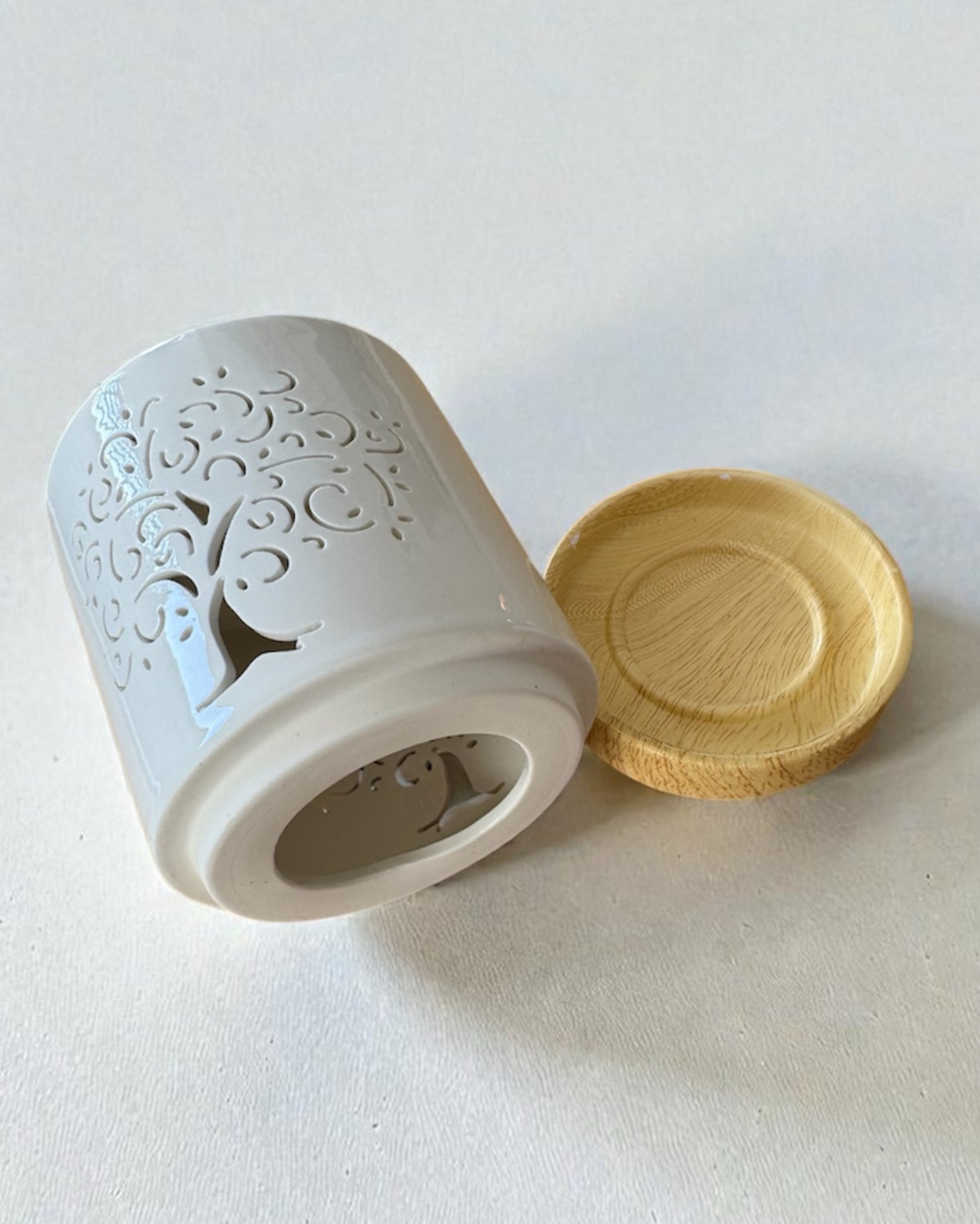 Fabricado en cerámica, este quemador encaja en cualquier espacio. Las aberturas en forma de árbol dejan pasar una luz suave cuando la vela está encendida, creando un ambiente cálido y agradable, sin recargar.